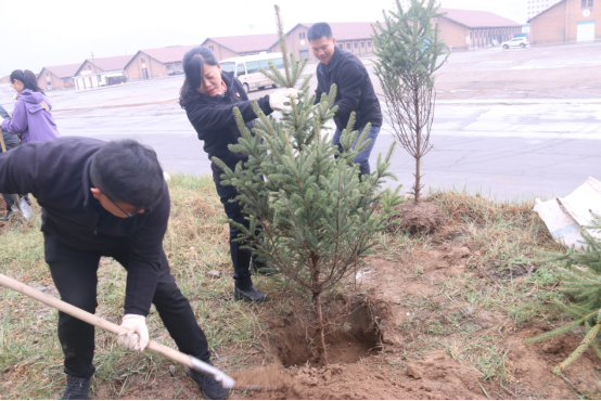 在園區內,大家興致勃勃,干勁十足,有的揮鍬挖坑、有的搬運樹苗、有的扶苗培土、有的提水澆灌,經過3個小時的忙碌,100棵松柏昂然挺立,呈現出一派生機勃勃的景象。